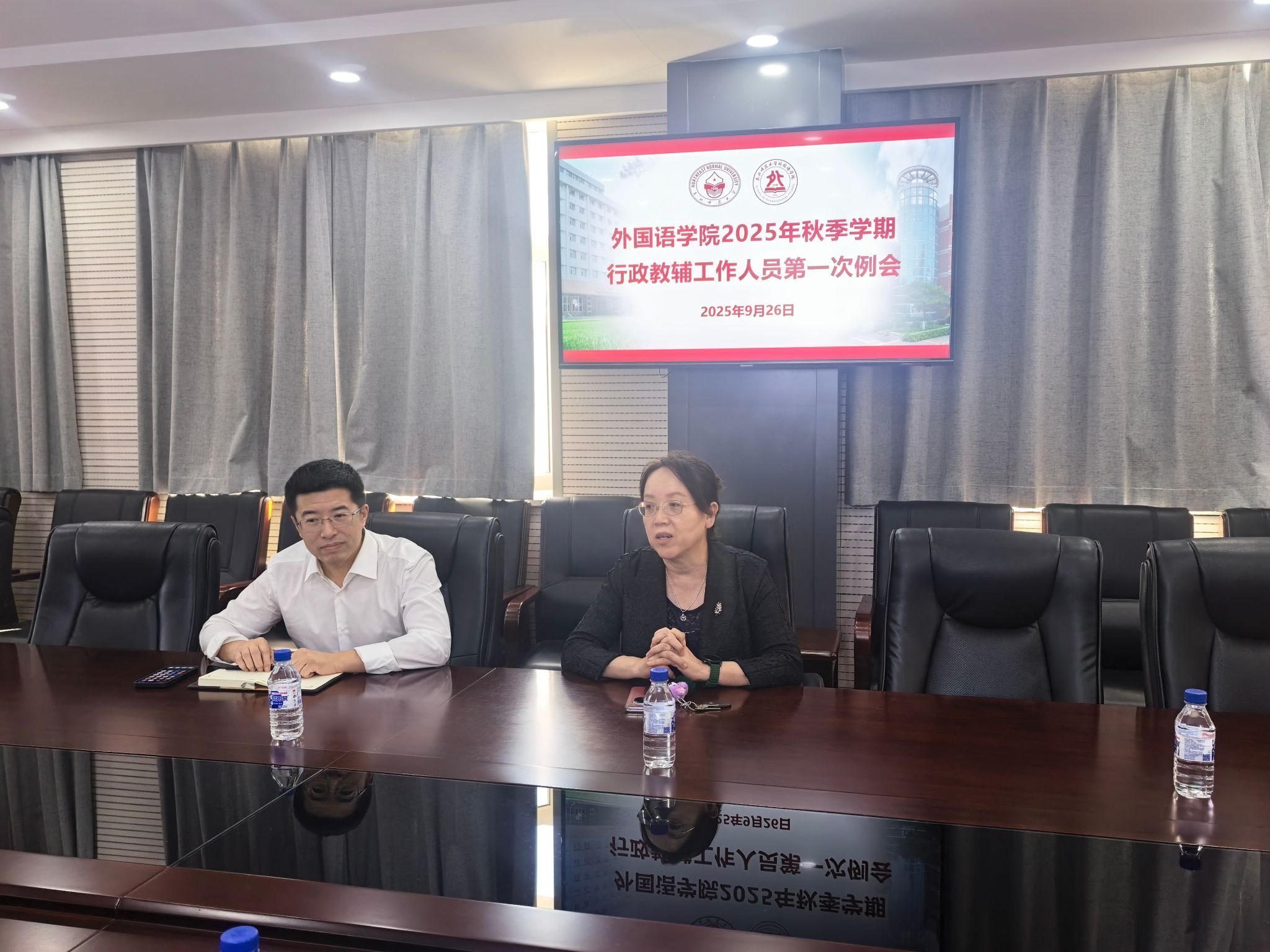 9月26日,外国语学院召开 2025 年秋季学期行政教辅工作人员第一次例会,全体行政教辅人员参会,会议由丁少慧副院长主持,高瑛院长发表讲话。会后,行政党支部同步召开党员大会,实现行政业务部署与党建学习深度融合,为学院新学期工作开篇布局。