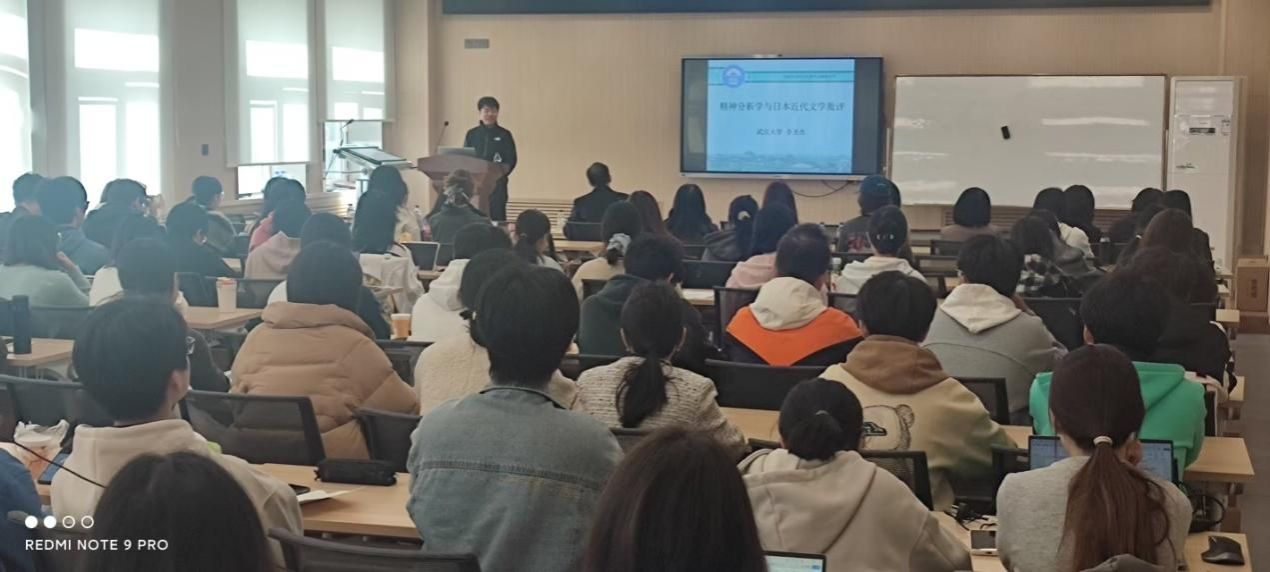 报告中,李教授以精妙的学术视野搭建起理论与文学的对话桥梁:他以弗洛伊德、荣格、拉康等精神分析学核心流派为“经”,以明治、大正、昭和三代日本文学经典为“纬”,清晰梳理出精神分析理论在日本近代文学批评中的接受脉络与本土化变异轨迹。他深刻指出,精神分析不仅是叩开文学文本“隐秘暗部”的关键钥匙,更成为建构日本现代主体认知的重要话语支撑;借助“创伤—补偿—升华”的理论模型,既能重新解读岛崎藤村、芥川龙之介、太宰治等文学巨匠笔下的“自我分裂”,更能精准捕捉作品背后折射的时代焦虑。尤为精彩的是,李教授以《破戒》《河童》《斜阳》等经典文本为实例,现场演示如何将抽象的精神分析概念转化为可操作的文本细读工具,让在场师生直观感受到理论照亮文学肌理的独特魅力,收获深刻的学术启发。