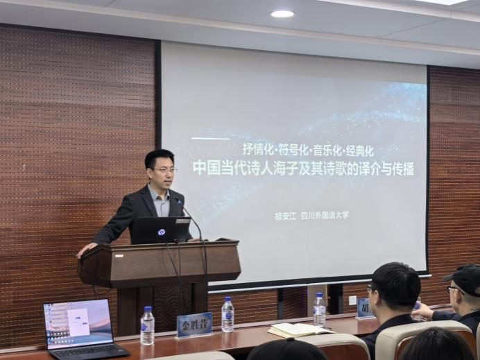 10月13日下午,我院特邀四川外国语大学副校长胡安江教授作题为《抒情化·符号化·音乐化·经典化——中国当代诗人海子及其诗歌的译介与传播》的专题报告。本次报告获得“东北师范大学哲学社会科学高水平学术交流基金项目”支持,由东北师范大学社会科学处主办,外国语学院承办。学术报告在外国语学院713室进行。外国语学院翻译方向PI金胜昔教授主持讲座。学院师生百余人到场聆听,现场学术氛围浓厚。