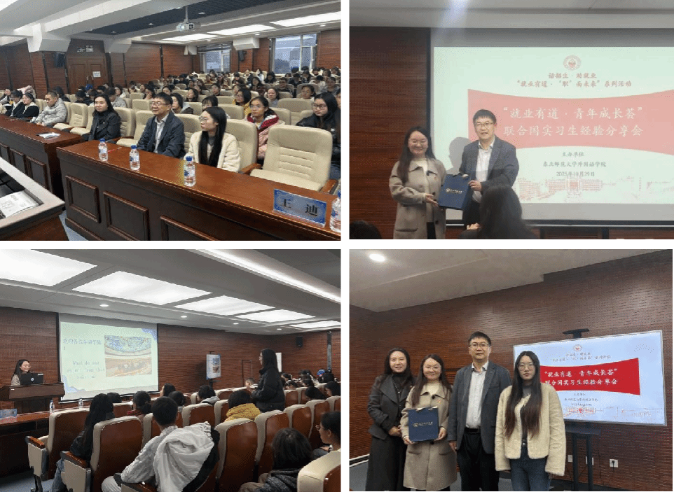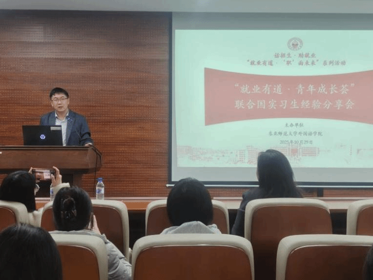 为进一步推动学院“招-培-就”一体化高质量联动,创新优化外语人才培养模式,学院党委精心策划“话招生·助就业”之——“就业有道·青年成长荟”系列活动,首期活动特别邀请学院2025届英语口译专业硕士毕业生王迪担任经验分享嘉宾。作为我校首位享受国家留学基金委资助、获国际组织实习岗位的优秀校友,王迪深度参与国际教育项目的开发协调工作,为外院学子树立了青年参与全球治理的标杆典范。10月29日下午,学院于713报告厅成功举办“联合国实习生经验分享会”,学院党委副书记兼副院长仇云龙、研究生会指导教师刘晨、研究生会执行主席唐燕平出席本次活动,近150余名本研学生踊跃参与,现场氛围积极热烈。