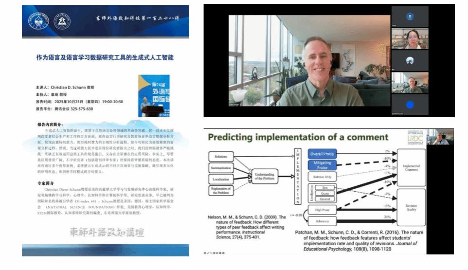 受外国语学院院长高瑛教授的邀请,美国匹斯堡大学著名语言学家Christian D. Schunn教授于2025年10月23日至11月7日期间,为我院师生开展了为期3周的语言学前沿话题系列讲座。此次活动以“人工智能与外语教学深度融合”为主题,探究了AI时代,语言学习与研究的数字化转向问题。Schunn教授的讲座共包含六场学术报告及两场专题工作坊,高瑛院长领衔主持了首场讲座“作为语言及语言学习数据研究工具的生成式人工智能”,即第128期东师外语致知讲坛。外国语学院解冰、姜言胜、仇云龙、姜莉、张福慧教授依次主持了其余各场讲座及工作坊。学院语言学、外语教学等相关方向的教师、硕/博士研究生、本科生,以及校外专家学者聆听了报告并参与讨论,每场讲座均有听众百余名。讲座期间,Schunn教授还与师生积极互动、交流,有效地实现了知识的传递与学术思想的有益碰撞。