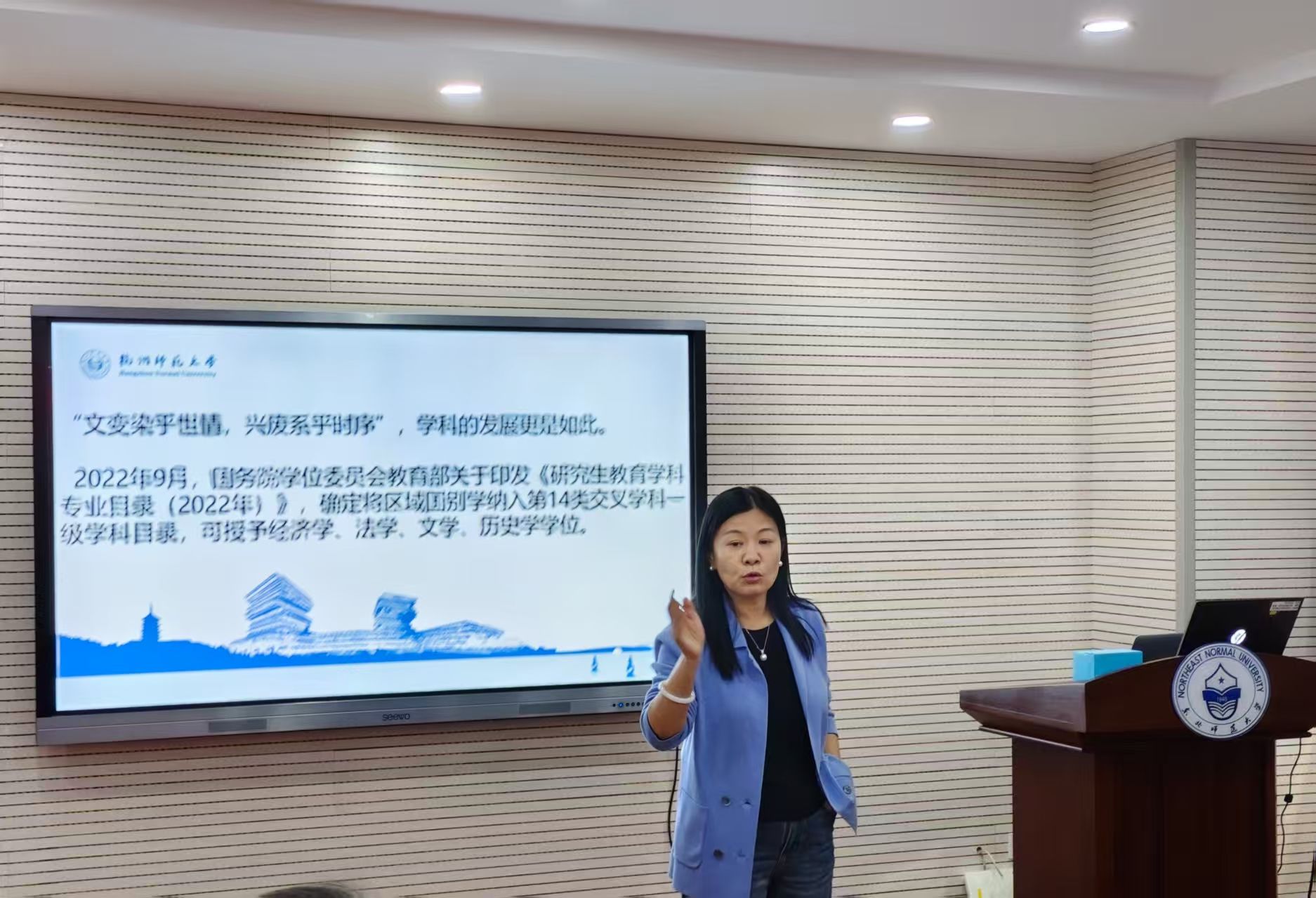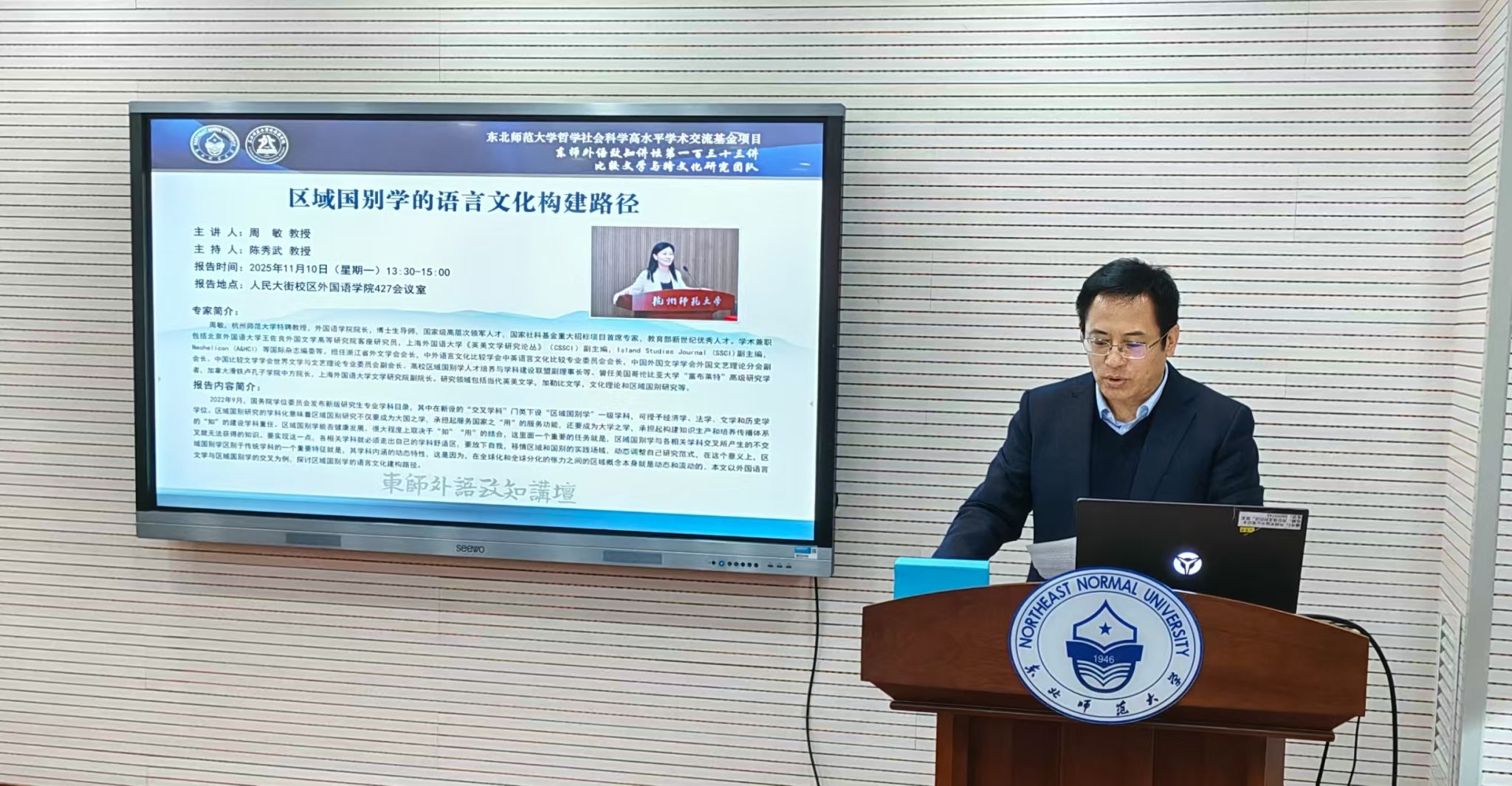 11月10日下午,我院特邀杭州师范大学外国语学院院长周敏教授主讲“东师外语致知讲坛”,开展题为“区域国别学的语言文化构建路径”的学术讲座,旨在通过跨学科交叉融合,构建“知”“用”结合的知识体系,以服务国家战略需求并推动学科内涵的创新发展。本次报告获得“东北师范大学哲学社会科学高水平学术交流基金项目”支持,由东北师范大学社会科学处主办,外国语学院承办。报告由副院长徐彬教授主持,现场学术氛围浓厚,互动交流热烈。
