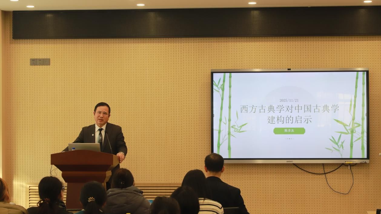 讲座伊始,陈多友教授以全球化时代古典学的核心价值为切入点,深刻剖析西方古典学从语文学考据到跨学科批判的演进脉络。他提出中国古典学需立足本土文明根基,通过“数字古典学”“文明互动论”等创新范式,实现从“接着西方讲”到“接着自己讲”的范式转型。陈教授特别强调:古典研究应超越文本考据,融合出土文献与传世典籍,构建“批判性反思+社会介入”的双轨路径,将“天下为公”“民惟邦本”等传统智慧转化为全球治理的东方方案。其前瞻性的“文化算法论”与“互动文明模型”引发全场共鸣,为古典学注入智能化、跨文化的新动能。