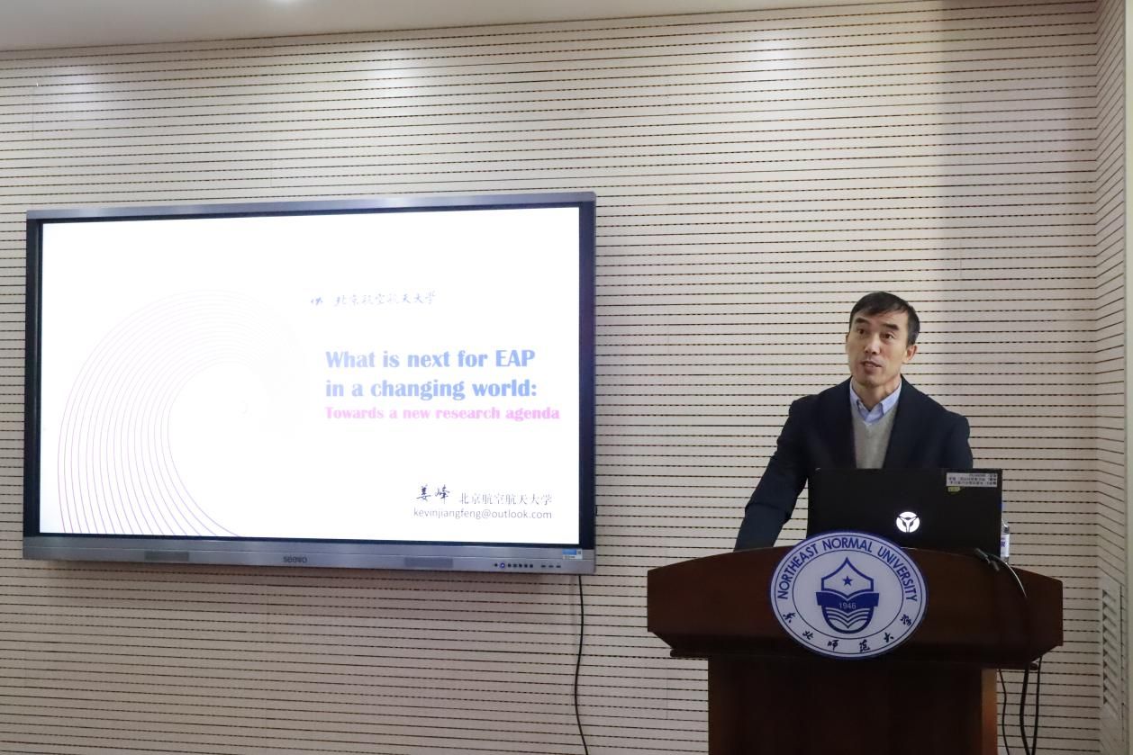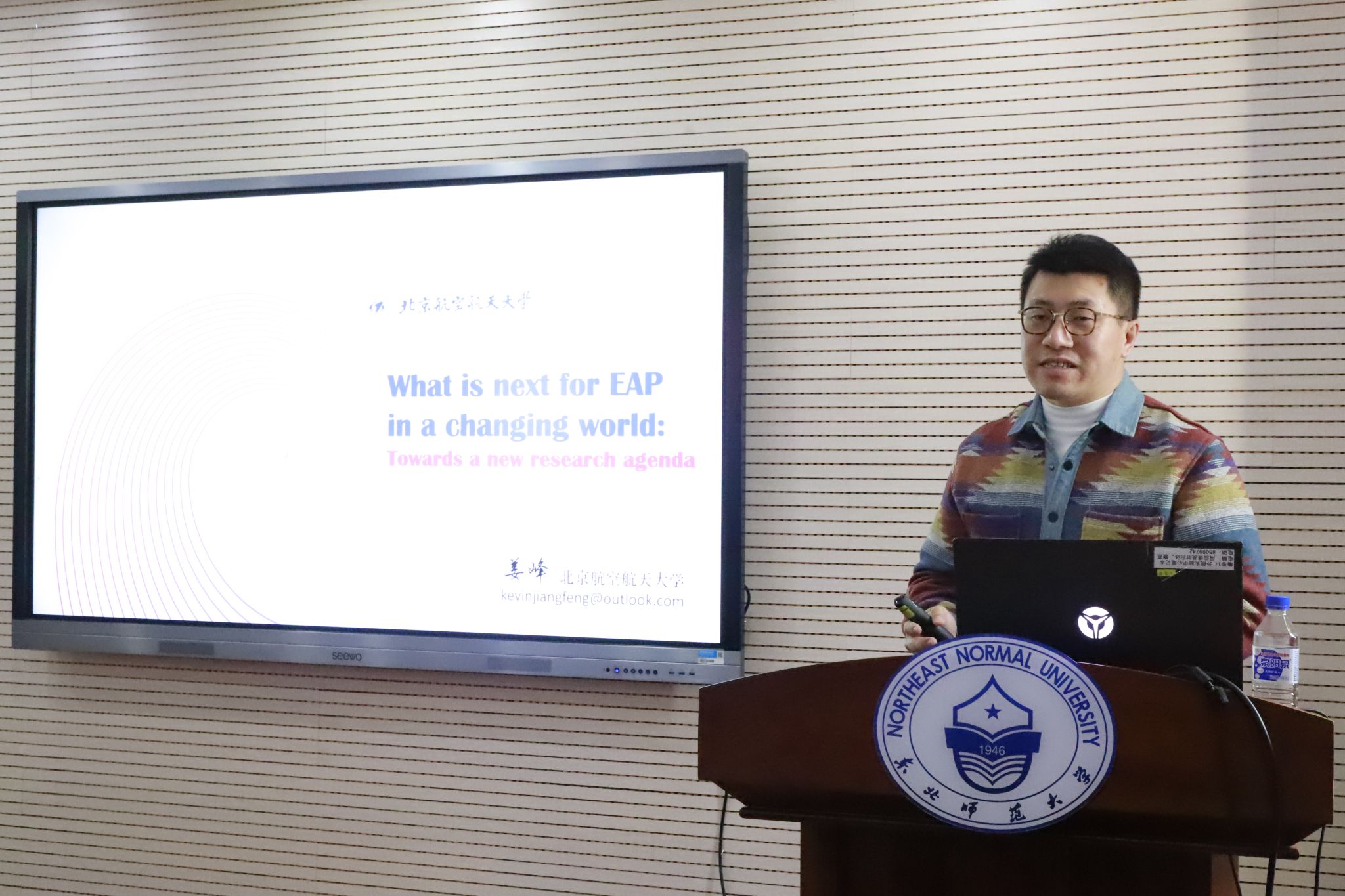 12月2日上午,我院特邀北京航空航天大学外国语学院副院长姜峰教授做客“东师外语致知讲坛”第一百四十七讲,开展题为“What is next for EAP in a changing world”的学术讲座。本次讲座系统梳理了学术英语研究的发展脉络,并结合当前全球化、数字化与跨学科协同三大趋势,深入探讨了学术英语教学与研究的新方向、新挑战与新路径。本次报告获得“东北师范大学哲学社会科学高水平学术交流基金项目”支持,由东北师范大学社会科学处主办,外国语学院承办。讲座由院长高瑛教授致辞,科研副院长陈秀武教授主持,杨忠教授、张绍杰教授出席并参与交流。